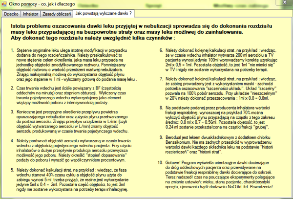 Otwierając ostatnią zkładkę menu "POMOC" kalkulatora nebulizacji "DROPS" można zapoznać się z wyłożonymi wyżej aspektami problemu z nieco innej perspektywy. Generalnie, co jest z jednej strony trudne, z druiej niezmiernie pasjonujące, nebulizacja "oglądana" z różnych perspektyw odkrywa swoje nowe, nieznane oblicza i jest nadal pasjonującą i nie do końca spenetrowaną dziedziną wiedzy medycznej. Wszystkim odwiedzającym strony edukacyjne SecuraNova życzę owocnej pracy nad doskonaleniem umiejętności optymalnego "komponowania" zabieów nebulizacji dla siebie lub swoich podopiecznych.