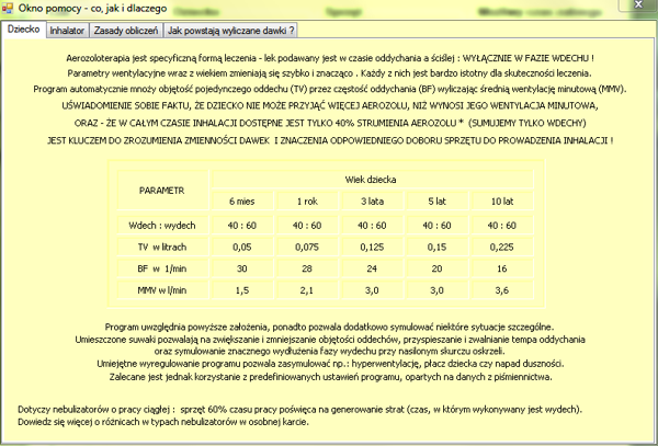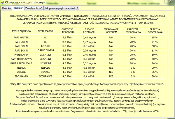 Wspopmniano wyżej o sytuacji optymalnej, w której produkcja aerozolu jest dobierana w taki sposób, by objętość aerozolu wytwarzanego przez inhalator w czasie wykonywania przez dziecko wdechu nie przekraczała zdolności poboru, czyli objętości normalnego wdechu TV. Skąd możemy czerpać niezbedną wiedzę dla rozstrzynięcia dylematu, czy sprzęt nie jest "zbyt mocny" dla dziecka w konkretnym wieku? Okazuje się, że wśród olbrzymiej ilości typów sprzętu jedynie nieliczni producenci oraz nieliczne firmy dystrybuujące sprzęt dokładją starań, by parametry inhalatorów opisane były poprawnie. Sprzęt oferowany przez firmę SecuraNova stanowi przykład poprawnego podejścia do zagadnienia. Rodzic, pielęniarka czy lekarz mają pełny wgląd w cechy sprzetu takie jak : objętość produkowanego w ciąu 1 minuty aerozolu, tempo zużycia płunu czy stopień rozdrobnienia aerozolu reprezentowany przez procentowy udział frakcji respirabilnej w globalnej masie aerozolu. Wraz z danymi definiującymi objętość zalegającą NRV (na zrzucie ekranu nie jest ona ujęta tabelarycznie) dysponujemy zestawem kluczowych informacji pozwalających na rozpoczęcie procedury optymalizacji terapii inhalacyjnej.