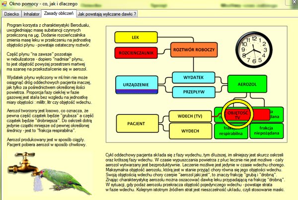 Jak widać na kolejnej rycinie, wymieszanie zakolorowanego na żółto leku oraz wyróżnionego kolorem czerwonym rozcieńczalnika (najczęściej jest to 0,9% roztwór NaCl), daje w efekcie konkretną objętość roztworu "roboczego", który wlewany jest do urządzenia. Ciemnogranatowa objętość roztworu na zawsze pozostanie w urzadzeniu. Jasnoniebieska objetość roztworu będzie pobierana przez sprzęt i emitowana jako aerozol. Nebulizator jest w swej istocie maszyną do meszania płynu z powietrzem. W celu wytworzenia aerozolu pobiera w konkretnej jednostce czasu pewną objętość płynu (wydatek) i miesza ją w tejże jednostce czasu z pewną objętością powietrza (przepływ). Powstaje zatem w konkretnej jednostce czasu aerozol, w którego skład wejdzie nie więcej płynu niż wydatek przypadający na jednostkę czasu oraz nie więcej powietrza, niż przepływ przypadający na tę jednostkę czasu. Aerozol taki zobrazowano kolorem zielonym. Jak wynika z ryciny, aerozol można pogrupować na "grubokroplisty" (deponowany w nosie, jamie ustnej i gardle) i "drobnokroplisty", zdolny do przeniknięcia wgłąb dolnych dróg oddechowych (frakcja respirabilna). Na rysunku frakcje te są wyrysowane odrębnie dla celów dydaktycznych, w rzeczywistości chory wchłania jednocześnie obie frakcje, a wiedzę o ich proporcji (jak już wiemy) czerpiemy z opisu sprzętu (udział % frakcji respirabilnej w masie aerozolu). Kolejnym podziałem, tym razem jak najbardziej realistycznym, jest podział na część aerozolu produkowaną w czasie trwania wdechu ("warstwa" górna) oraz w czasie trwania wydechu ("warstwa" dolna). W czasie inhalacji "twarzą w twarz" ze sprzętem staje pacjent zobrazowany na rycinie kolorem żółtym. Jest jasne, że w czasie trwania wydechu nie może on wejść w interakcję z aerozolem - dolna "wydechowa warstwa" aerozolu nidy nie będzie dla pacjenta dostępna. Szansę na pobranie aerozlu pacjent uzyskuje w czasie trwania wdechu. Na schemacie zobrazowano, jak w czasie wdechu pacjent "zanurza naczynie o objętości TV" w górnej "warstwie" aerozolu. Jak widać, zaczerpnie on zarówno cząstki "grube" (które moą być przyczyną zbędnego narażenia górnych dróg oddechowych na lek), jak również istotne dla leczenia oskrzeli cząstki "drobne". Z rysunku można wyciągnąć również wniosek, że nie cały dostępny aerozol znalazł się "w naczyniu" TV. W tym przypadku sprzęt wyprodukował zbyt wiele aerozolu, by w czasie wdechu objętością TV chory mógł go zagospodarować. Rysunek papużki ma na celu uzmysłowienie, że przy tzw. "slinym sprzęcie" niemowlę czy małe dziecko jest w stanie wychwycić jedynie nieznaczną częśc strumienia aerozolu. Cała jego niezospodarowana część "zatruwa" jedynie środowisko i stanowi stratę leku niemożliwą do odzyskania.